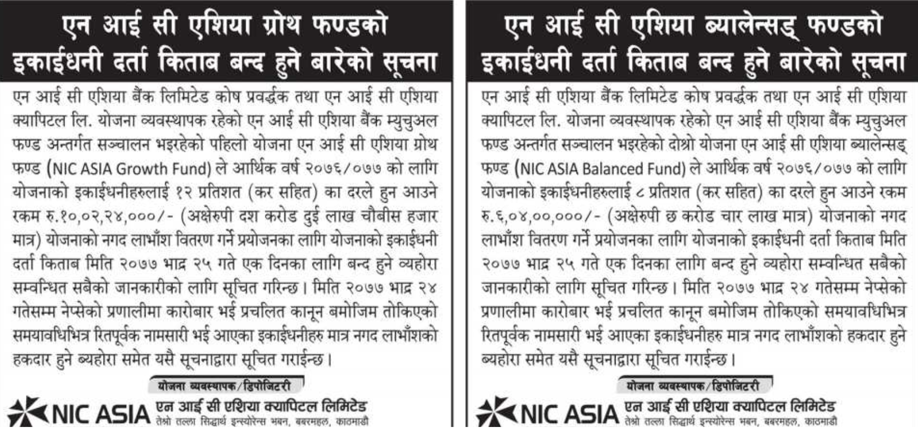 काठमाडौं । एनआइसी एशिया क्यापिटल योजना व्यवस्थापक रहेको एनआइसी एशिया ग्रोथ फण्ड र एनआइसी एशिया ब्यालेन्सड् फण्डले गत आर्थिक वर्षको नगद लाभांश प्रयोजनका लागि बुकक्लोज मिति तय गरेका छन् ।