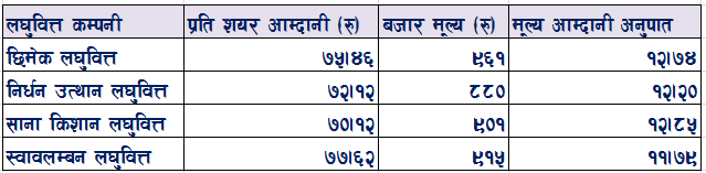 स्वावलम्बन लघुवित्तको संचालक समितिको बैठकले २६ प्रतिशत बोनस शेयर र १४ प्रतिशत नगद लाभांस प्रस्ताव गरेको छ। त्यस्तै निर्धन उत्थान लघुवित्त को संचालक समितिको बैठकले २५ प्रतिशत बोनस शेयर र १५ दशमलव ५३ प्रतिशत नगद लाभांस प्रस्ताव गरेको छ भने साना किशान लघुवित्तको संचालक समितिको बैठकले २७ दशमलव २५ प्रतिशत बोनस शेयर र १ दशमलव ४३ प्रतिशत नगद लाभांस प्रस्ताव गरेको छ।