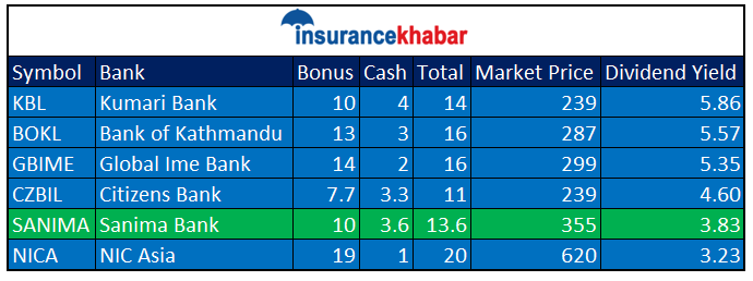लाभांश प्रस्ताव गरेका बैंकहरुको प्रस्तावित लाभांश र कम्पनीको हालको बजार मूल्यलाई आधार मान्दा कुमारी बैंकले प्रस्ताव गरेको लाभांशमा सर्वाधिक प्रतिफल देखिएको छ । कुमारी बैंकको प्रस्तावित १४ प्रतिशत लाभांश र हालको बजार मूल्य २३९ लाई आधार मान्दा कम्पनीको प्रस्तावित लाभांशको अहिलेको बजार मूल्यमा खरिद गर्दाको प्रतिफल ५ दशमलव ८६ प्रतिशत रहेको छ भने दोश्रोमा बैंक अफ काठमाण्डुले १६ प्रतिशत लाभांश प्रस्ताव गरेकोमा हालको बजार मूल्य २८७ लाई आधार मान्दा कम्पनीको प्रस्तावित लाभांशको अहिलेको बजार मूल्यमा खरिदगर्दाको प्रतिफल ५ दशमलव ५७ प्रतिशत रहेको छ।
