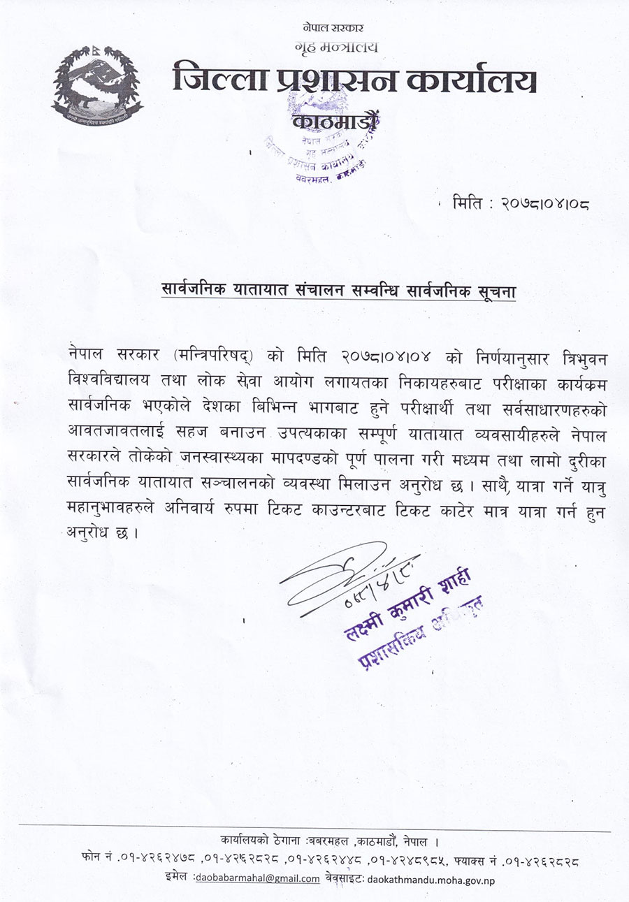 त्रिभुवन विश्वविद्यालय तथा लोक सेवा आयोग लगायतका परीक्षालाई समेत मध्यनजर गर्दै सरकारले तोकेको मापदण्ड पालना गरी सार्वजनिक यातायात चलाउन जिल्ला प्रशासन कार्यालय काठमाडौंले शुक्रबार सूचना जारी गर्दै जनाएको छ ।