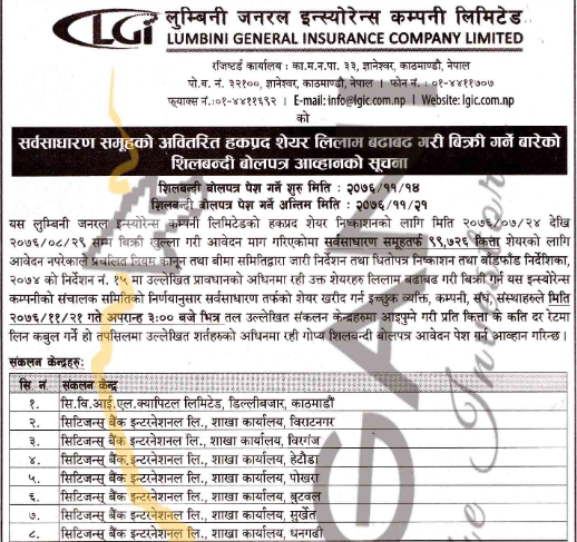 काठमाडौं । लुम्बिनी जनरल इन्स्योरेन्स कम्पनी लिमिटेडले सर्वसाधारण समूहको ९९ हजार ७२६ कित्ता हकप्रद शेयर लिलाम बढाबढ गरी बिक्री गर्ने भएको छ । इन्स्योरेन्सले गत कात्तिक २४ गतेदेखि मंसिर २९ गतेसम्म निष्काशन तथा बिक्री खुल्ला गरेको हकप्रद शेयरमा आवेदन नपरेपछि शेयर लिलामीमार्फत बिक्री गर्न लागेको हो ।