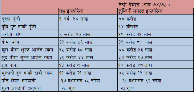 प्रभु इन्स्योरेन्सले ६५ करोड ३८ लाख कुल बीमा शुल्क रकम आर्जन गरेकोमा ३९ करोड ४४ लाख खुद बीमा शुल्क आर्जन गरेको छ त्यस्तै लुम्बिनी जनरल इन्स्योरेन्सले ८८ करोड ५३ लाख कुल बीमा शुल्क रकम आर्जन गरेकोमा ५४ करोड ९७ लाख खुद बीमा शुल्क आर्जन गरेको छ।