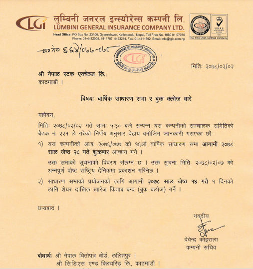 काठमाडौं । लुम्बिनी जनरल इन्स्योरेन्स कम्पनीले आफ्नो १६औं वार्षिक साधारण सभा जेठ २८ गते गर्ने भएको छ । कम्पनीको जेठ २ गते बसेको संचालक समितिको बैठकले उक्त सभाको मिति तय गरेको हो ।