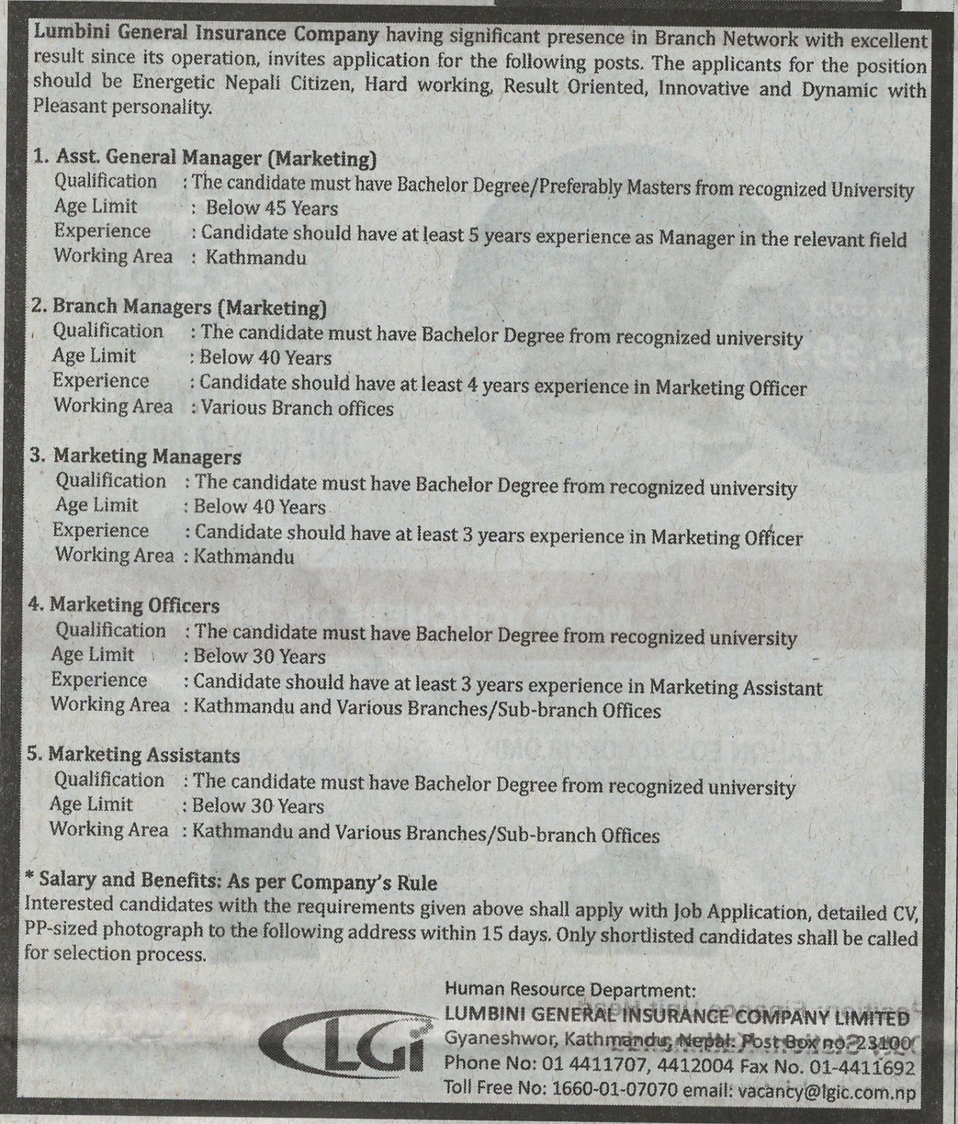 लुम्बिनी जनरल इन्स्योरेन्स कम्पनीले विभिन्न पदका लागि कर्मचारीहरु आहवान गरेको छ । कम्पनीले बुधबार एक विज्ञापन जारी गर्दै दरखास्त आहवान गरेको हो ।