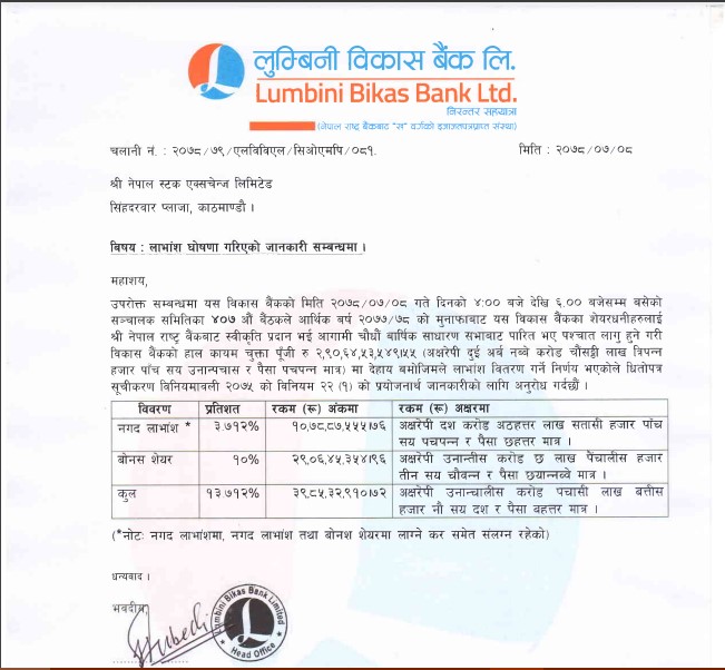 काठमाडौं । लुम्बिनी विकास बैंकले लाभांश प्रस्ताव गरेको छ । कम्पनीको हिजो सोमबार बसेको संचालक समितिको बैठकले आर्थिक वर्ष ७७/७८ को मुनाफाबाट आफ्ना शेयरधनीलाई वितरण गर्ने लाभांश प्रस्ताव गरेको हो ।