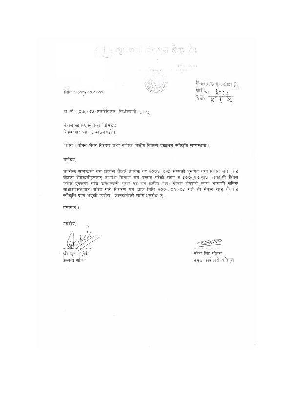 बैंकको प्रस्तावित बोनशले नेपाल राष्ट्र बैंकबाट साउन ५ गते लाभांश वितरण गर्नको लागि स्वीकृति पाएको । बैंकले उक्त बोनस शेयर आगामी साधारण सभाबाट पारित गरेपछि शेयरधनीहरुलाई वितरण गर्नेछ ।