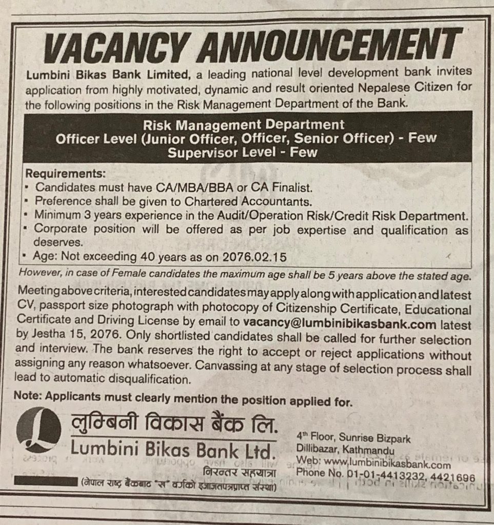 लुम्बिनी विकास बैंकले विभिन्न पदका लागि कर्मचारीको माग गरेको छ । बैंकले रिक्स म्यानेजमेन्ट डिपार्टका लागि केही र सुपर भाईजर लेभलका लागि केही कर्मचारीको माग गरेको हो ।