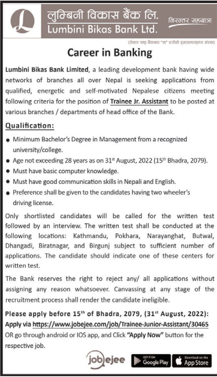 काठमाडौं । लुम्बिनी विकास बैंक लिमिटेडले कर्मचारीको माग गरेको छ । बैंकले ट्रेनी जुनियर असिस्टेन्टका लागि कर्मचारीको माग गरेको हो। उक्त पदका लागि बैंकले न्यूनतम व्यवस्थापन संकाय अन्तर्गत स्नातक उर्तिण गरेको हुनुपर्ने जनाएको छ ।