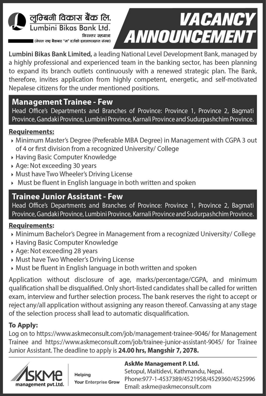 काठमाडौं । लुम्बिनी विकास बैंकले विभिन्न पदका लागि कर्मचारीको माग गरेको छ । कम्पनीले म्यानेजमेन्ट ट्रेनीका लागि केही र ट्रेनी जुनियर असिस्टेन्टका लागि केही संख्यामा कर्मचारीको माग गरेको छ । बैंकले आफ्नो हेड अफिसका लागि केही, ब्रान्चका लागि केही र प्रादेशिक शाखा कार्यालयका लागि केही संख्यामा कर्मचारीको माग गरेको हो ।