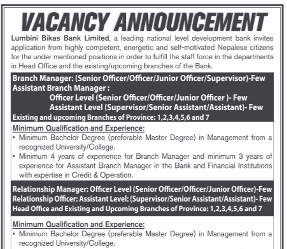 काठमाडौं । लुम्बिनी विकास बैंक लिमिटेडले विभिन्न पदका लागि कर्मचारीको माग गरेको छ । बैंकले ब्रान्च म्यानेजर, असिस्टेन्ट ब्रान्च म्यानेजर, रिलेसनसिप म्यानेजर र रिलेसनसिप अफिसर पदका लागि कर्मचारीको माग गरेको हो ।