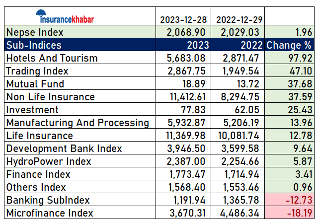 वर्ष २०२३ मा होटल तथा पर्यटन समूहको परिसूचकमा सर्वाधिक ९७.९२ प्रतिशतको वृद्धि देखिएकोमा दोश्रोमा व्यापार समूहको परिसूचकमा ४७.१० प्रतिशतको वृद्धि देखिएको छ ।