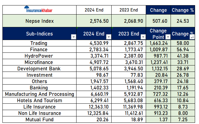 यो वर्ष सबै समूहगत परिसूचक बढेका छन् । १३ समूहगत परिसूचकमध्ये व्यापार समूहको समूह सर्वाधिक वृद्धि भएको छ । एक वर्षको अवधिमा व्यापार समूहको परिसूचक सर्वाधिक ५८ प्रतिशतले वृद्धि भएको छ । त्यस्तै दोश्रोमा फाइनान्स समूह रहेको छ । फाइनान्स समूहको सूचक करिब ५७ प्रतिशतले वृद्धि भएको छ । यो वर्ष सबै भन्दा कम म्युचुअल फण्डको परिसूचक ७ दशमलव २५ प्रतिशत वृद्धि भएको छ ।