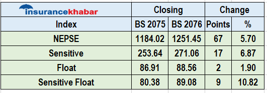 नोट : २०७५ को अन्तिम कारोवार दिन ट्रेडिङ्ग उपसूचकका कम्पनीको कारोवार नभएकोले २०७५ चैत्र २१ गतेको तथ्यांक लगिएको हो।