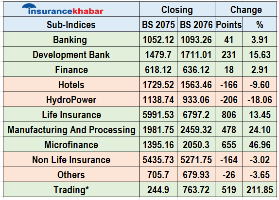 यो वर्ष सबै भन्दा धेरै ट्रेडिङ्ग उपसूचकमा २११ दशमलव ८५ प्रतिशतको वृद्धि देखिएको छ। वाणिज्य बैंक उपसूचक ३ दशमलव ९१, विकास बैंक उपसूचक १५ दशमलव ६३ प्रतिशत, फाइनान्स उपसूचक २ दशमलव ९१, जीवन बीमा उपसूचक १३ दशमलव ४५ , उत्पादन तथा प्रसोधन उपसूचक २४ दशमलव १०, लघुवित्त उपसूचक ४६ दशमलव ९६ प्रतिशतले बढेका छन्।