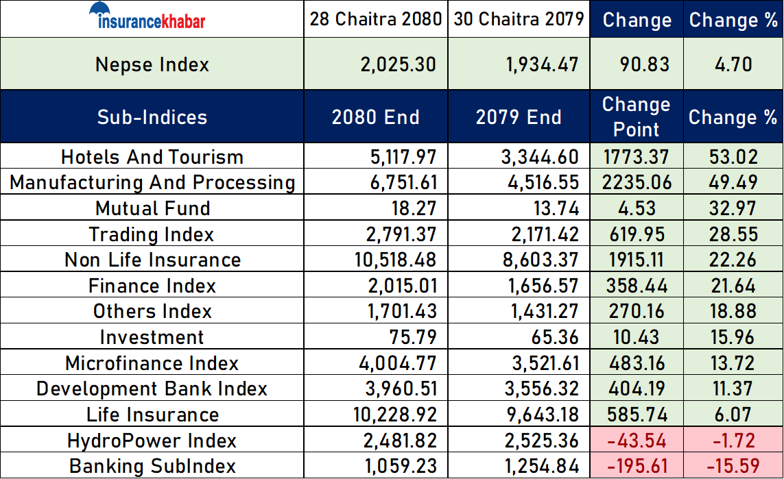 नेप्सेमा कारोबार हुने १३ समूहगत परिसूचकमध्ये ११ समूहगत परिसूचक यो वर्ष बढेका छन्। हाइड्रोपावर र वाणिज्य बैंकको परिसूचक मात्र यो वर्ष घटेको देखिन्छ। हाइड्रोपावरको सूचक सामान्य १.७२ प्रतिशतले घट्दा वाणिज्य बैंकको परिसूचक भने १५.५९ प्रतिशतले घटेको छ।