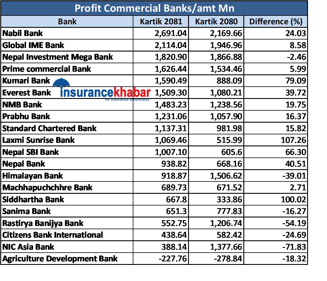 अघिलो वर्षको तुलनामा यो वर्ष कात्तिकसम्म १३ वटा वाणिज्य बैंकको नाफा बढेको छ भने ६ वटाको घटेको छ। एउटा बैंक भने घाटामा रहेको छ।
