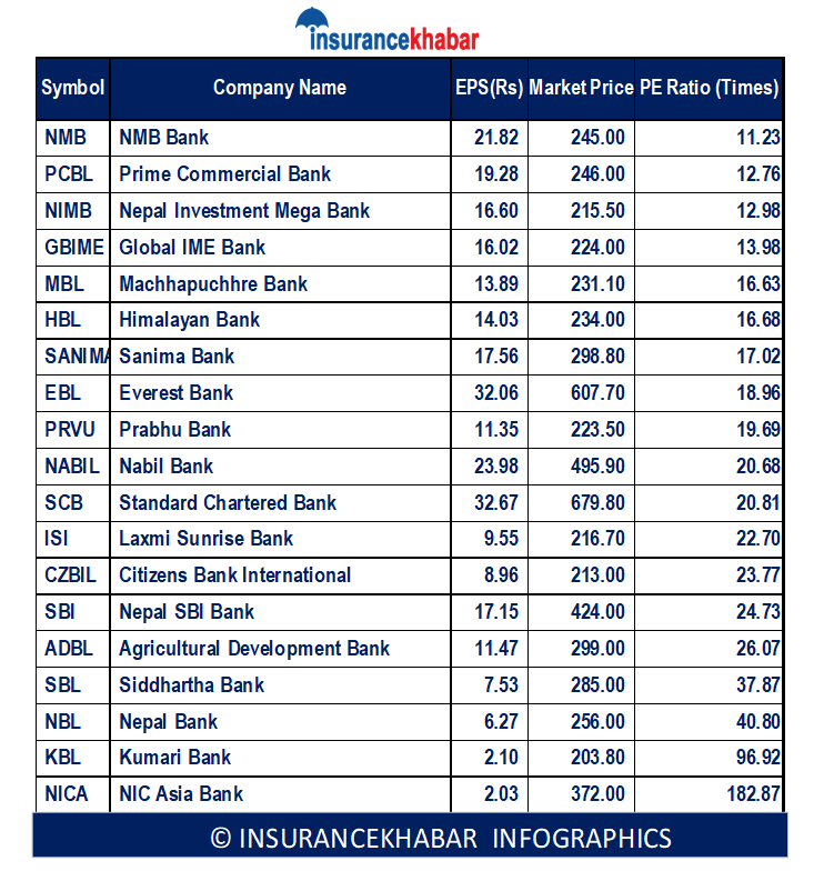१५ देखि २० पीई रेसियो भएका ५ बैंक रहेका छन्। जसमा माछापुच्छ्रे, हिमालयन, सानिमा, एभरेस्ट र प्रभु बैंक छन्।
