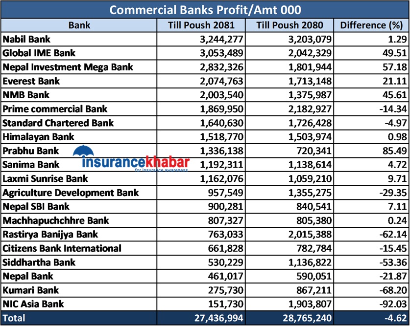 नेपाल राष्ट्र बैंकले आज सार्वजनिक गरेको चालु आर्थिक वर्षको पुससम्मको तथ्यांकअनुसार २० वटा वाणिज्य बैंकहरुले २७ अर्ब ४३ करोड ६९ लाख रुपैयाँ नाफा आर्जन गरेको हुन्। अघिल्लो वर्ष यही अवधिसम्म वाणिज्य बैंकहरुले २८ अर्ब ७६ करोड ५२ लाख रुपैयाँ नाफा आर्जन गरेका थिए। अघिल्लो वर्षको तुलनामा समीक्षा अवधिमा बैंकहरुको नाफा ४.६२ प्रतिशतले घटेको छ।
