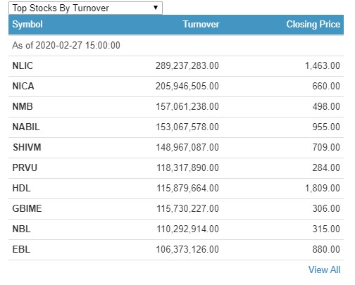 दिनभरिमा १ सय ८० कम्पनीको १ करोड ८ लाख ५९ हजार ६ सय ५६ कित्ता शेयर किनबेच हुँदा ४ अर्ब ४६ करोडमाथिको कारोबार भएको छ । सबैभन्दा धेरै नेपाल लाइफको २८ करोड ९२ लाख रुपैयाँको कारोबार भएको छ ।