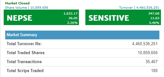 दिनभरिमा १ सय ८० कम्पनीको १ करोड ८ लाख ५९ हजार ६ सय ५६ कित्ता शेयर किनबेच हुँदा ४ अर्ब ४६ करोडमाथिको कारोबार भएको छ । सबैभन्दा धेरै नेपाल लाइफको २८ करोड ९२ लाख रुपैयाँको कारोबार भएको छ ।