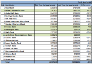 कुल २० वटा वाणिज्य बैंकहरुले दोस्रो त्रैमासम्म २८ अर्ब ७६ करोड ५२ लाख रुपैयाँ नाफा आर्जन गरेका छन्। यो नाफा अघिल्लो वर्षको यही अवधिसम्मको तुलनामा भने ९.९४ प्रतिशतले कम हो। अघिल्लो वर्ष यी बैंकहरुको कुल नाफा ३१ अर्ब ९४ करोड ४१ लाख रुपैयाँ रहेको थियो।