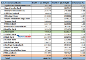 चालु आर्थिक वर्षको ९ महिनासम्मको तथ्यांक हेर्दा हाल सञ्चालनमा रहेका २० वाणिज्य बैंकमध्ये १३ वटाको नाफा घटेको छ भने ७ वटाले नाफा बढाउन सफल भएका छन्। यी बैंकले समीक्षा अवधिसम्म ४० अर्ब ६८ करोड रुपैयाँ नाफा आर्जन गरेका छन्। अघिल्लो वर्ष यही अवधिसम्म वाणिज्य बैंकहरुको नाफा ४७ अर्ब १ करोड रुपैयाँ थियो। यस हिसाबले वाणिज्य बैंकहरुको नाफा १३.४७ प्रतिशतले घटेको छ।