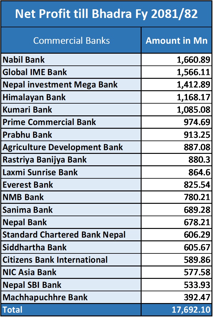 चालु आर्थिक वर्षको भदौसम्म वाणिज्य बैंकहरुले गरेको नाफा