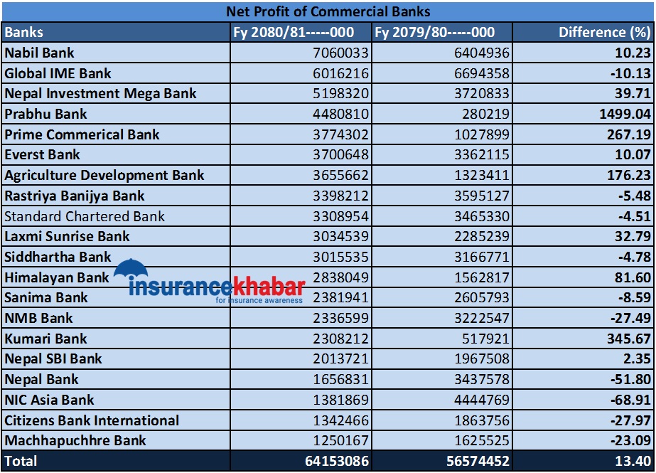 गत आर्थिक वर्षमा २० वटा वाणिज्य बैंकहरुले कुल ६४ अर्ब १५ करोड ३० लाख रुपैयाँ नाफा आर्जन गरेका छन्। अघिल्लो वर्ष ५६ अर्ब ५७ करोड ४४ लाख रुपैयाँ नाफा आर्जन गरेका थिए। अघिल्लो वर्षको तुलनामा गत वर्ष बैंकहरुको नाफा १३.४० प्रतिशतले बढेको छ।