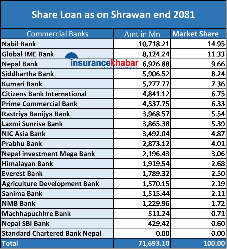 साउनसम्म सबैभन्दा बढी शेयर लोन प्रवाह गर्नेमा नबिल बैंक रहेको छ। नबिलबाट १० अर्ब ७१ करोड ८२ लाख रुपैयाँ शेयर लोन गएको छ।