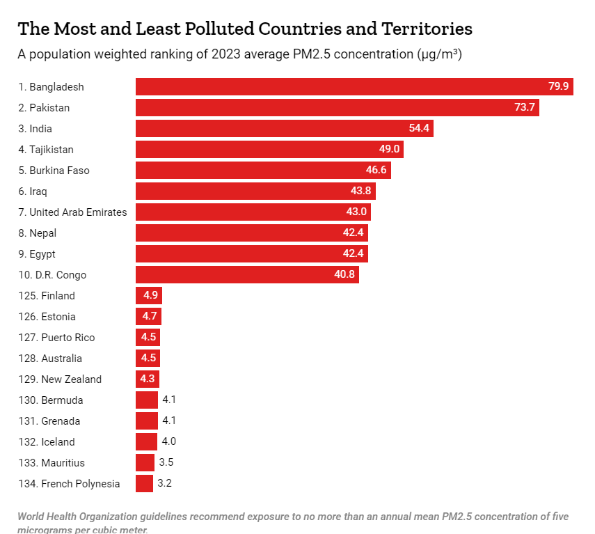 प्रतिवेदनका अनुसार सर्वाधिक वायू प्रदुषण हुने देशहरुमध्ये दक्षिण एशियाली मुलुक बंगलादेश,पाकिस्तान र भारत क्रमशः पहिलो, दोश्रो र तेश्रो स्थानमा छन् । यसैगरी बुर्किना फासो, इराक र संयुक्त अरब इमिरेट्स क्रमशः पाँचौं, छैटौं र सातौं स्थानमा छन् ।