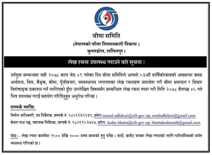 काठमाडौं । बीमा समितिले आफ्नो ५३ औँ वार्षिकोत्सवको अवसरमा अर्थतन्त्र, वित्त, बैंक, पूँजी बजार, व्यवस्थापन लगायतका लेख रचना पठाउन आग्रह गरेको छ । समितिले यी उल्लेखित विषयका लेख रचनाहरु समावेश गरी समाचार र विचार विशेषाङ्क प्रकाशन गर्न लागिएको हुँदा सम्बन्धीत विषयमा लेख रचना तयार पारी बैशाख ५ गतेभित्र उपलब्ध गराइसक्नुपर्ने जनाएको छ ।