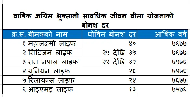 बीमा समितिले आ.व. २०७५।७६ को आय व्ययको आधारमा स्वीकृत गरेको बोनश दर जम्मा रु.१३ जीवन बीमा कम्पनीहरुमध्ये कै कमजोर हो । यस्तो न्यून बोनश दरका कारण बीमितले वर्षभरमा बोनशवापत बीमांकको १.३ प्रतिशत रकम मात्र बोनश प्राप्त गर्नेछन् । अर्थात् रु. १० लाख बीमांकको जीवन बीमा गराउँदा जम्मा १३ हजार रुपैयाँ मात्र बोनश प्राप्त गरिरहेका छन् ।