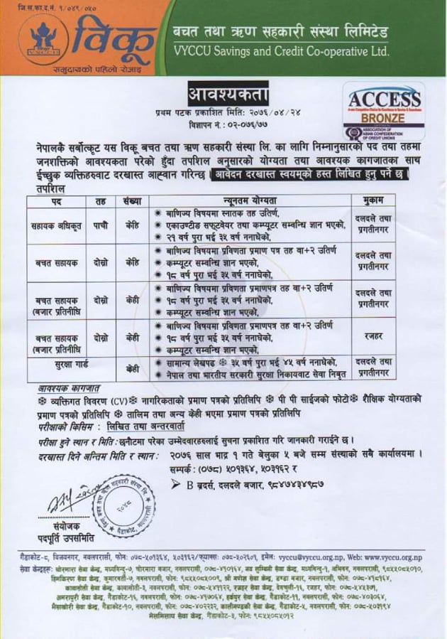 काठमाडौँ । विकू बचत तथा ऋण सहकारी संस्था लिमिटेडले विभिन्न पदमा कर्मचारी माग गरेको छ । संस्थाले सहायक अधिकृत, बचत सहायक, बचत सहायक (बजार प्रतिनिधि) र सुरक्षा गार्ड पदमा केही कर्मचारी माग गरेको हो ।