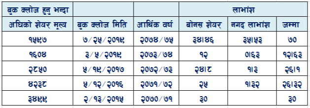 आर्थिक वर्ष २०७४।७५ मा कम्पनीले ३४ दशमलव ४६ प्रतिशत बोनस शेयर र ३५ दशमलव ५३ प्रतिशत नगद लाभांश दिएकोमा सो लाभाश प्रयोजनका लागि कम्पनीले २०१९।७।२५ तारिकमा बुक क्लोज गरेको थियो । सो मिति भन्दा अघिल्लो दिन कम्पनीको बजार मुल्य एक हजार ५ सय ९७ रुपैयाँ थियो ।