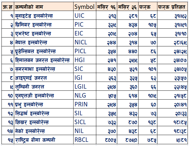 त्यसैगरी निर्जीवन बीमातर्फ ८ दिनको अवधिमा सबैभन्दा धेरै यूनाइटेड इन्स्योरेन्सको बजार मुल्य बढेको छ । मंसिर १६ गते २ सय १३ रुपैयाँमा कारोबार भएको कम्पनीको शेयरमुल्य आज मंसिर २६ गते २ सय ८१ रुपैयाँमा कारोबार भएको छ ।