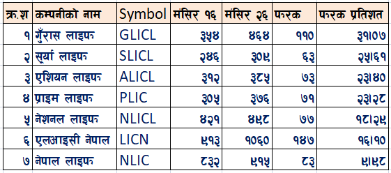 बीमा कम्पनीहरुको दोस्रो बजारको कारोबार हेर्ने हो भने जीवन बीमा तर्फ ८ दिनको अवधिमा सबैभन्दा धेरै गुँरास लाइफको बजारमुल्य बढेको छ । मंसिर १६ गते सोमवार ३ सय ५४ रुपैयाँ शेयर मुल्य भएको गुराँस लाइफ इन्स्योरेन्स कम्पनीको मंसिर २६ गते बिहीवार शेयर मुल्य बढेर ४ सय ६४ रुपैयाँमा कायम भएको छ ।
