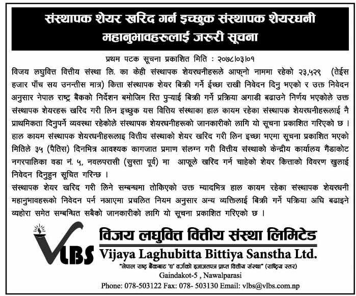 नेपाल राष्ट्र बैंकको निर्देशन बमोजिम सर्वप्रथम संस्थाका संस्थापक शेयरधनीहरुलाई नै प्राथमिकता दिनुपर्ने भएकाले संस्थापक शेयर खरिद गर्न इच्छुक संस्थापक शेयरधनीहरुलाई सूचना प्रकाशन भएको मितिले ३५ दिनभित्र आवश्यक कागजपत्र संकलन गरेर संस्थाको केन्द्रिय कार्यालय, गैँडाकोट नगरपालिका वडा नं ५, नवलपरासीमा आइपुग्ने गरि निवेदन दिन आग्रह गरेको हो ।