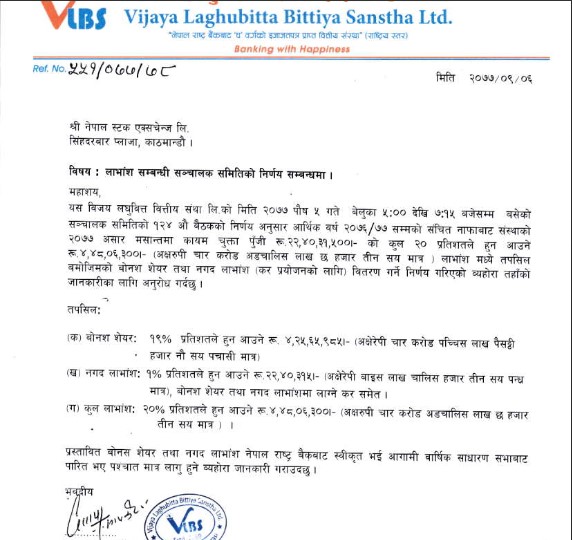 उक्त प्रस्ताव राष्ट्र बैंक र आगामी साधारण सभाबाट अनुमोदन पश्चात् लगानीकर्तालाई वितरण प्रक्रिया अघि बढ्नेछ ।