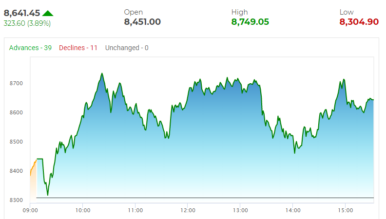 बिएससी सेंसेक्स सूचक १४१० दशमलव ९९ को अंकले वृद्धि भएर २९९४६ दशमलव ७७ अंक मा बन्द भएको छ भने यसैगरी निफ्टी सूचक ३२३ दशमवल ६० अंकले वृद्धि भएर ८६४१ दशमलव ४५ अंकमा पुगेको छ।