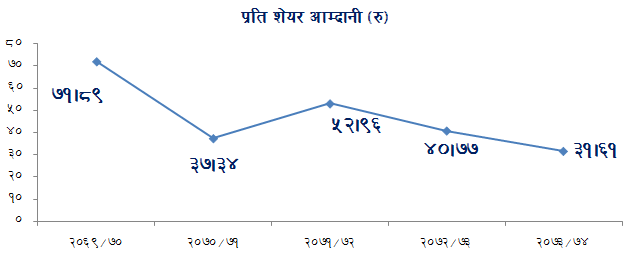- कम्पनीको प्रति शेयर आम्दानी ६९ प्रतिशतले वृद्धि हुँदै १६ रुपैयाँ ७४ पैसा रुपैँया पुगेको छ । प्रति शेयर आम्दानी अघिल्लो आर्थिक वर्षको दोश्रो त्रैमासमा ९ रुपैयाँ ९३ पैसा थियो ।
