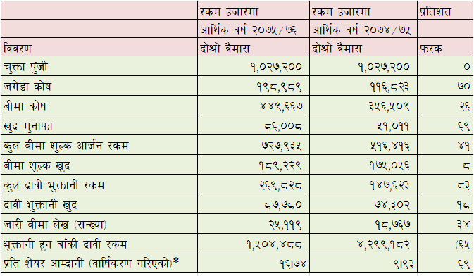 हिमालयन जनरल इन्स्योरेन्सले सार्वजनिक गरेको चालु आर्थिक वर्षको दोश्रो त्रैमासिक वित्तीय विवरण अनुसार आर्थिक वर्ष २०७५/७६ र २०७४/७५ बीच तुलना गर्दा :