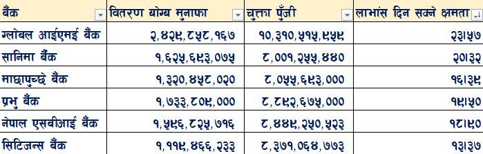 त्यस्तै, प्रभु बैंकको लाभांश दिन सक्ने क्षमता १९ दशमलव ५० प्रतिशत रहेको छ । माछापुच्छे बैंकको १६ दशमलव ३९ प्रतिशत लाभांश दिन सक्ने क्षमता रहेको छ । सिटिजन्स बैंकको १३ दशमलव ३७ प्रतिशत रहेको छ । नेपाल एसबिआई बैंकको १८ दशमलव ९० प्रतिशत लाभांश दिन सक्ने क्षमता रहेको छ र सानिमा बैंकको २० दशमलव ३२ प्रतिशत लाभांश दिन सक्ने क्षमता रहेको छ ।