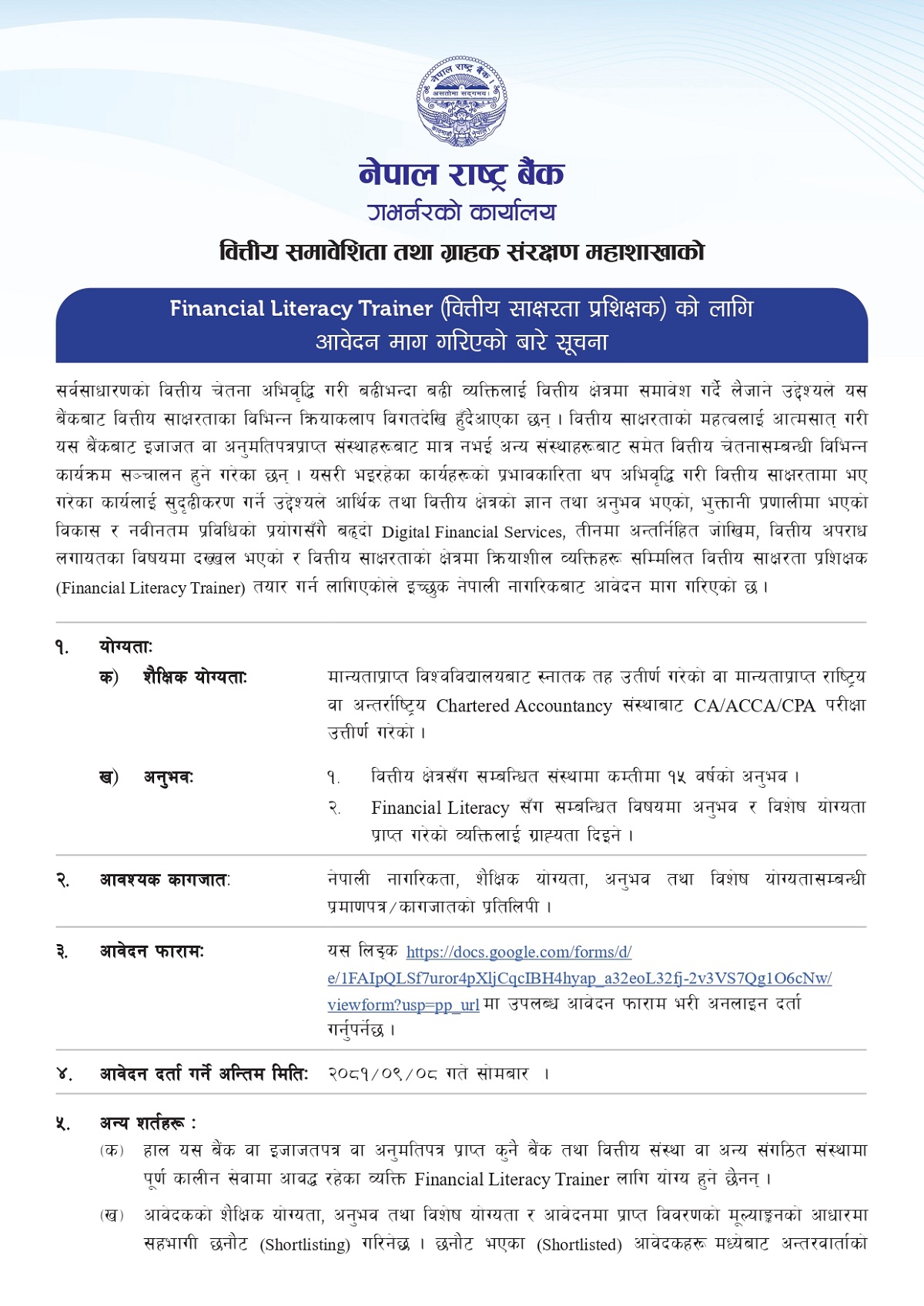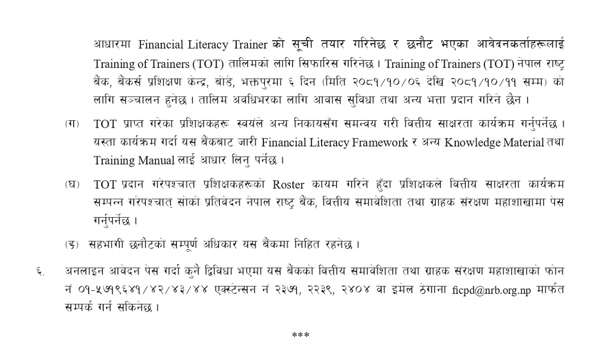 काठमाडौं । नेपाल राष्ट्र बैंकले वित्तीय साक्षरता प्रशिक्षकका लागि आवेदन आह्वान गरेको छ।
