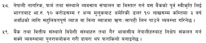 त्यस्तै नेपाली बैंकहरुले गैर आवासिय नेपाली लगायतका क्षेत्रमा निक्षेप संकलन गर्न थप खुकुलो बनाइएको मौद्रिक नीतिको अर्धबार्षिक समीक्षामा उल्लेख छ । यसैबीच, नेपालका विभिन्न बैंक तथा वित्तीय संस्थाहरुले चालु आवको छ महिनामा सात अर्ब रुपैयाँ वैदेशिक ऋण लिएको जनाएको छ ।