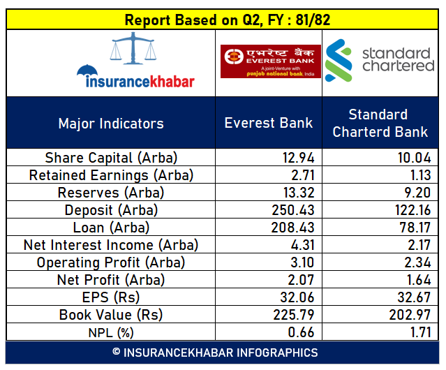 काठमाडौं । एभरेष्ट बैंक र स्ट्यान्डर्ड चार्टर्ड बैंकले चालु आर्थिक वर्ष २०८१।८२को दोस्रो त्रैमासको वित्तीय विवरण सार्वजनिक गरेको अवस्थामा दुई बैंकबीच इन्स्योरेन्स खबरले प्रमुख वित्तीय सूचकलाई आधार मानेर गरेको तुलनात्मक अध्ययनः