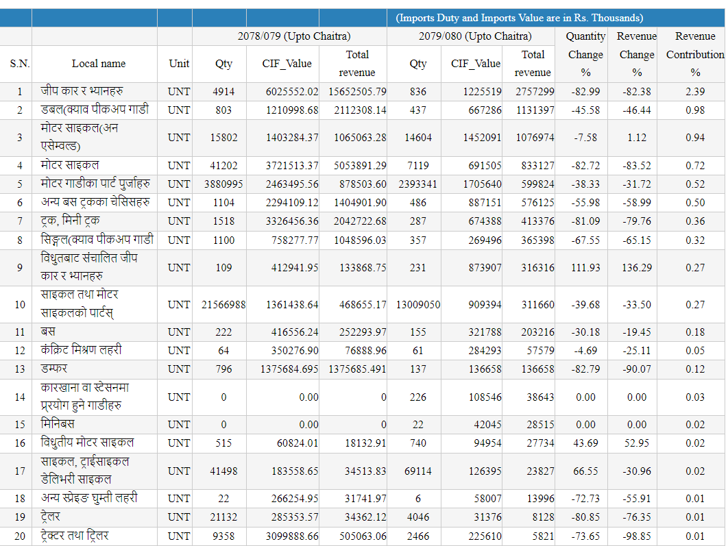 गत आवकाे चैत्र मसान्तसम्ममा याे नाकाबाट ४९१४ थान जीप कार भ्यान भित्रिएकाेमा यस पटक चैत्र मसान्तसम्ममा जम्मा ८३६ थान आयात भएकाे छ। यसैगरी  डबल क्याबिन भएकाे जीप पाेहाेर ८०३ थान आयात भएकाेमा साेही अवधिमा यसपटक जम्मा ४३७ थान आयात भएकाे छ।