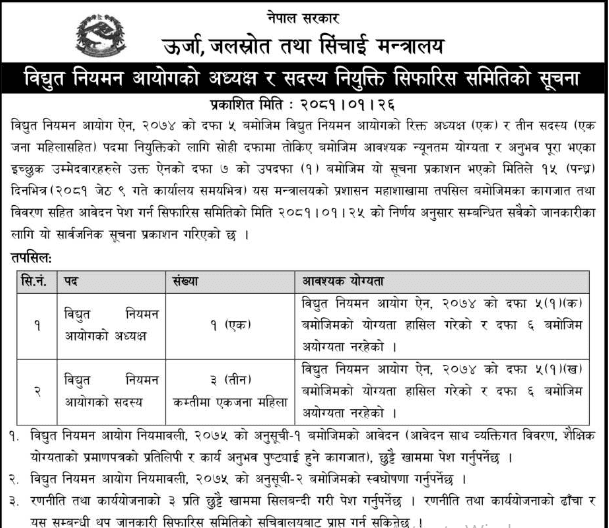 विद्युत् नियमन आयोगमा अध्यक्ष र तीन सदस्यका लागि दरखास्त आह्वान
