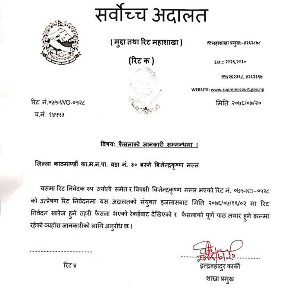 गत वर्षदेखि परेको मुद्दामा त्यतिबेला नै जिल्ला अदालत काठमाडौंले ज्योति विरुद्ध पक्राउ पुर्जी जारी गरेको थियो । जिल्ला अदालतको पक्राउ पुर्जीलाई चुनौति दिदै उनी सर्वोच्च अदालत गएका थिए । सर्वोच्चले कार्तिक १८ गते पक्राउ गर्ने जिल्ला अदालतको आदेश सदर गरेको थियो । १८ गते जिल्ला अदालतको निर्णय सदर गरे इजलासको आदेशपछि कार्तिक २० गत सर्वोच्च प्रशासनले पत्र लेखेको थियो ।