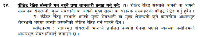 क्रेडिट रेटिङ नियमावली २०६८ काे नियम ३४ मा क्रेडिट रेटिङ संस्थाले आफ्नाे वा आफ्नाे संस्थापक शेयरधनी, मुख्य शेयरधनी वा आफ्नाे मुख्य संस्था वा सहायक संस्थाहरूकाे क्रेडिट रेटिङ गर्न नहुने स्पष्ट प्रावधान छ।