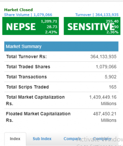 नेप्से परिसूचक साताको चौथौ दिन २८ दशमलव ७३ अङ्कले बढेर १२०९दशमलव ७१ अङ्कमा बन्द भएको छ। कारोबार रकम ३६ करोड ४१ लाख पुगेको छ ।